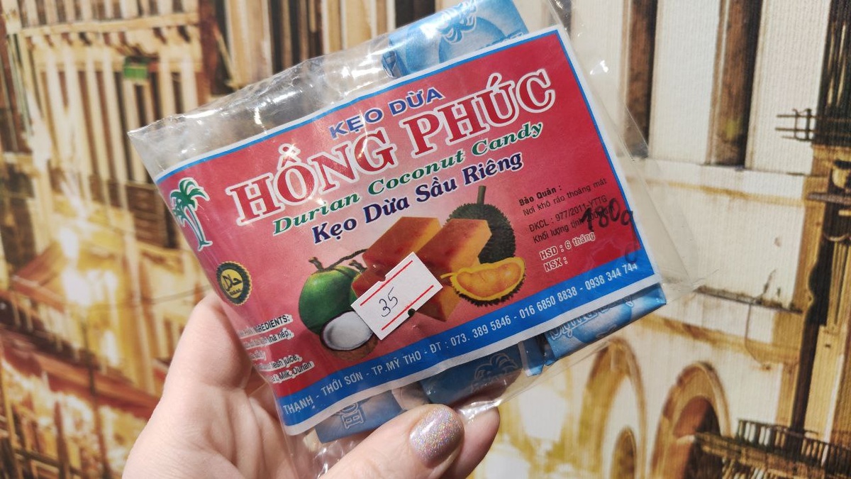 🇻🇳 Я жду не дождусь своей поездки в Азию. Не только потому что я там ещё не была и там совершенно другая природа, но и из-за дуриана. У меня прям пункт в списке желаний - попробовать этот фрукт. Он специфичный, а значит это вызов для меня. Пока что я пробовала только кондитерские изделия с ним (конфетки из нескольких стран Азии, печенья и кексы). Эти кокосовые конфетки с дурианом приехали ко мне из Вьетнама. Такой обертки конфеток никогда не видела, не глянцевая, а как будто газетка😁 Конфетка ещё обернута в тонкую, прозрачную пленку, которая съедобна. Она прям тает на языке. Сама конфетка напоминает ириску, жуется, немного прилипает к зубам. Аромат на любителя - сладкие нотки кокоса и запах дуриана (он специфичный, очень хочу сравнить с ароматом фрукта). Во вкусе мне так же чувствуется и кокос и дуриан. По вкусу конфетки очень похожи на аналогичные конфетки из соседних азиатских стран (Таиланд, Индия, Китай). По опыту - конфетки не всем заходят, но мне нравятся. Жизнь так коротк