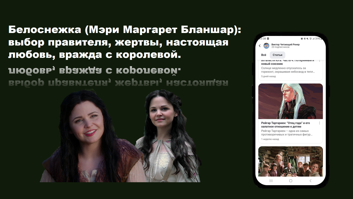 Белоснежка не просто принцесса, которая единственная наследница престола. Она лидер. Она не боялась трудностей, она училась, она собирала вокруг себя людей и вела их за собой. Она показала, что даже из самой сложной ситуации можно выйти победителем, если не сдаваться и бороться за то, во что веришь.