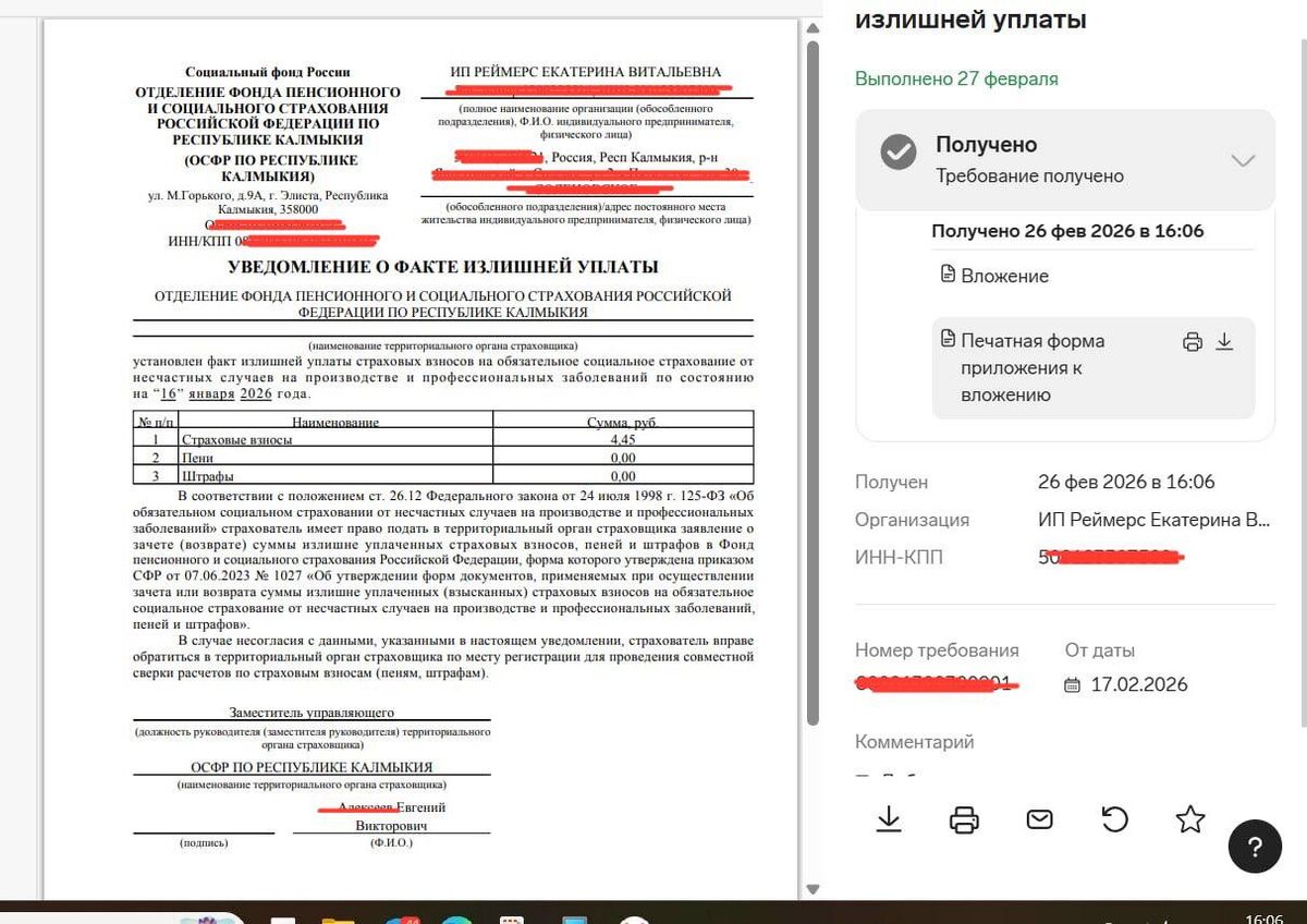 С начала 2026 года предприниматели начали получать уведомления из СФР о переплате по взносам на травматизм. Суммы приходят разные — от небольших до довольно ощутимых. 📄 Пример такого уведомления — на скриншоте. К нам обратился клиент с таким уведомлением. Разобрали ситуацию и проверили переплату. Что сделали: ✔️ Определили причину переплаты ✔️ Проверили корректность начислений ✔️ Подсказали, как правильно распорядиться суммой Дальше есть два варианта: 1️⃣ Если сумма небольшая — её можно учесть при следующей оплате взносов. 2️⃣ Если сумма значительная — подать заявление в СФР и вернуть деньги на расчётный счёт. ❕Главное — не оставлять такие уведомления без внимания. Это деньги предпринимателя. Если тоже получали такие уведомления из СФР — поставьте реакцию ❤️👇 А если нужно разобраться с уведомлениями или переплатами — напишите нам в личные сообщения, поможем проверить @ChurCons #КЕЙС