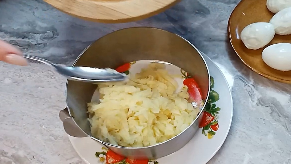 Совсем скоро первый весенний праздник и сегодня я хочу предложить рецепт вкусного, сочного, необыкновенного слоеного салата под названием "Семь пятниц". Не знаю как девушки, а мужчины этот салат точно оценят. Картофель отварите или запеките в духовке. Остудить, очистить и натереть на крупной терке. Выложить на тарелку первым слоем. Я выкладываю в кольцо диаметром 16 см. Хорошо выровнять и нанести слой майонеза. Луковицу нарезать соломкой и обжарить в небольшом количестве растительного масла. Немного посолить, поперчить и выложить вторым слоем. Выровнять и слегка утрамбовать. Майонезом смазывать не нужно. Яйца отварить, остудить и почистить. Натереть на крупной терке и выложить на лук. Смазать майонезом. Теперь грибы. Можно взять любые на ваше усмотрению. По рецепту грибы нужны сухие. Их предварительно замачивают и отваривают в подсоленной воде. Я взяла свежие шампиньоны. Нарезать их на ломтики и обжарить в небольшом количестве растительного масла. Выложить на яйца и выровнять. Майонезо