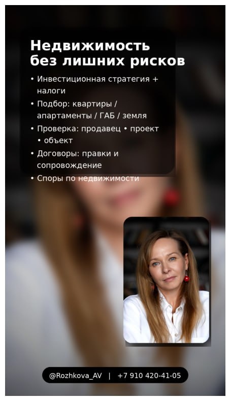 ». Боль в другом: страшно ошибиться — с объектом, документами, налогами, продавцом. И потом годами разруливать то, что можно было увидеть на старте. Я как раз про этот старт — чтобы вы заходили в сделки спокойно и с пониманием, что делаете и зачем. Чем я могу быть вам полезна в недвижимости: Инвестиционная стратегия Разбираем цель (доход/рост/сохранить капитал), сроки, риски, бюджет — и собираем понятный план: что покупать, под какой сценарий и как выходить. В стратегии учитываю и налоговую логику (чтобы прибыль не превратилась в «сюрприз» после сделки), плюс семейные моменты в рамках недвижимости: на кого оформлять, доли, совместная собственность — где могут быть риски. Подбор объектов под задачу Квартиры, апартаменты, ГАБ, земельные участки — не “что красивее”, а то, что подходит вашей цели и цифрам. Проверка перед сделкой (продавца / проекта / объекта) Смотрю документы и условия, проверяю ключевые риски и даю понятное заключение: можно заходить или лучше не надо / что нужно исп