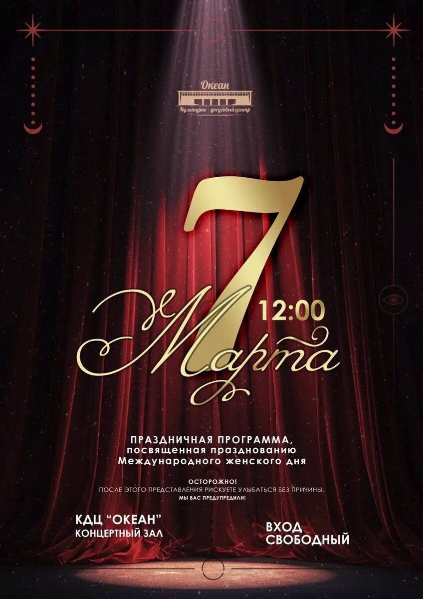 ! 💖Дорогие женщины! Для вас звучат самые тёплые слова, искренние поздравления и, конечно, музыкальные подарки. 🤎Праздничный концерт состоится 7 марта в 12:00 в КДЦ «Океан». 💖В программе - выступления творческих коллективов . Приходите заряжаться хорошим настроением и весенним вдохновением! Вход свободный. Ждём вас!