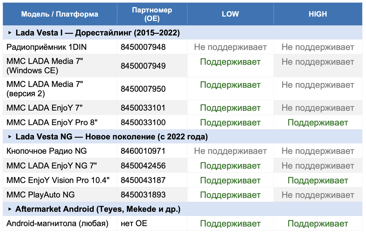 Перед покупкой камеры критически важно знать точную модель и поколение магнитолы. Lada Vesta выпускалась с совершенно разными мультимедийными системами — от Windows CE до современного Android. Тип магнитолы определяет разъём, способ подключения видеосигнала и нужен ли переходник.