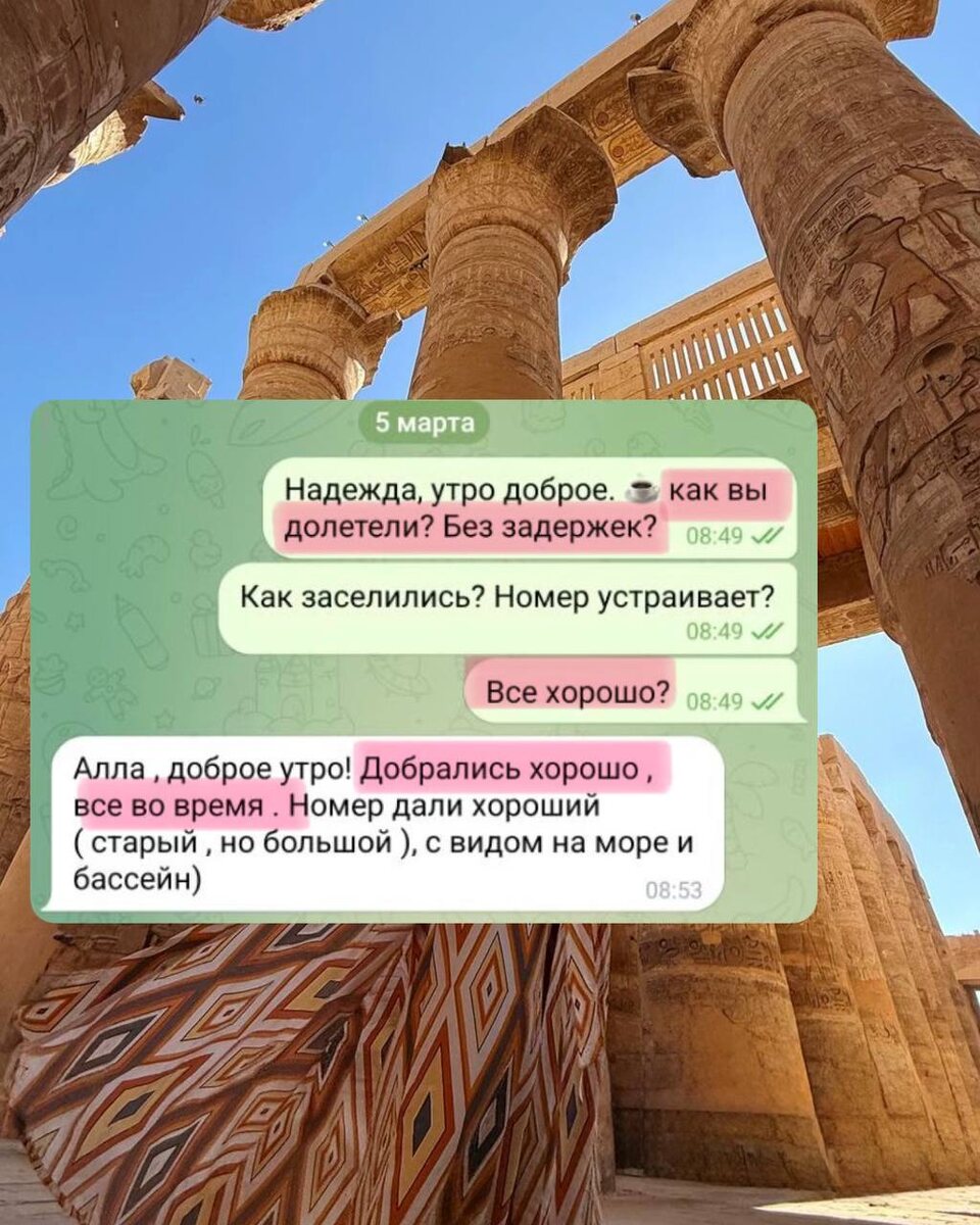 ! Алла, рассматривали для отдыха Египет. Что скажете? Можно ли туда сейчас в отпуск? На данный момент МОЖНО! Официального уведомления от МИД РОССИИ, о том, что лететь в Египет нельзя, не было! Вот у меня вчера две семьи вылетели в Египет 🇪🇬 От одной туристки я уже получила первый привет из отпуска: Добрались хорошо, все во время! 👌 В любом случае, я держу руку на пульсе и вам буду рассказывать об обстановке. ⭐️⭐️⭐️⭐️Просто будьте рядом!