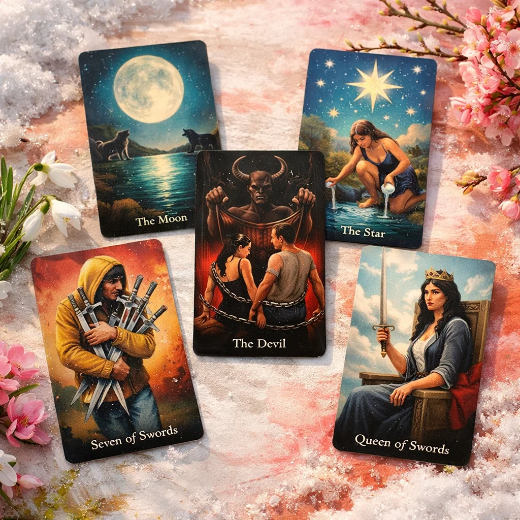 Спасибо каждому за лайки, подписки, комментарии, донаты! 🙏❤️ Вы вдохновляете меня создавать новые расклады и делиться важными посланиями. Пусть всё добро возвращается к вам сторицей! 💖 Девочки, этот расклад не про тревожность и не про «везде враги». Карты легли иначе. Это про момент, когда судьба ставит человека на развилку и проверяет не силу воли, а качество внутреннего выбора. Такие проверки всегда приходят перед ростом. Перед тем, как вам откроют новую дорогу, мир сначала смотрит: вы научились себя слышать или всё ещё продаёте себя за одобрение? Суть предупреждения простая: скоро к вашему порогу подойдёт что-то привлекательное, но не настоящее. Оно будет выглядеть как шанс, как быстрый выход, как «наконец-то решение». И именно поэтому оно опасно. Ложные вещи редко приходят в форме ужаса — они приходят в форме соблазна. Карты предупреждения: Луна, Семёрка Мечей, Дьявол, Звезда, Королева Мечей. Луна открывает расклад — и это сразу говорит: будет туман. Недосказанность. Полуправда.