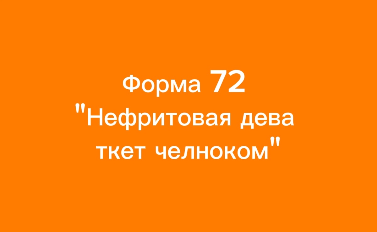 Конечное положение формы 72. Вес на правой согнутой ноге, левая нога сзади прямая еле касается пола. Корпус на восток, левая рука согнута локтем вниз, ладонью на восток, пальцы вверх в 2 см от правого запястья. Правая рука согнута с ладонью на восток расположена на уровне подбородка, кисть направлена пальцами вверх. Голова на восток, взгляд вдаль поверх правого предплечья. Это исходное положение формы 73.