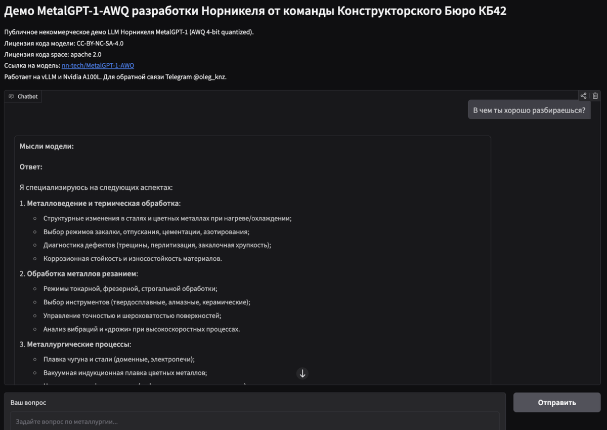 Использовали официальную MetalGPT-1 AWQ версию, оптимизированную для использования меньших вычислительных мощностей [ссылка на Hugging Face nn-tech]. https://huggingface.co/nn-tech/MetalGPT-1 Дата выхода официальной браузерной версии с интерфейсом обозначена как “скоро” – ждем вместе с вами.