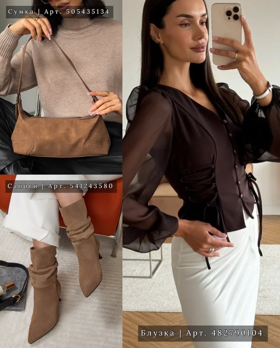 - сумка арт: 505435134 + сапоги арт: 541243580 + блузка арт: 482790104 — женственно, уютно, дорого на вид.