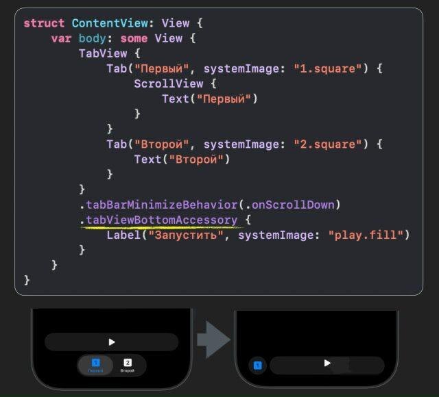 Про .tabBarMinimizeBehavior мы рассказывали тут Модификатор .tabViewBottomAccessory позволяет добавить к тапбару интерактивный элемент, который будет висеть над тапбаром (если он есть) или просто внизу, а при сворачивании тапбара располагаться внутри тапбара. Можно добавлять в tabViewBottomAccessory целые View (HStack, VStack), но пока в бета-версии это работает не совсем корректно. Вы можете отслеживать состояние tabViewBottomAccessory из объекта окружения \.tabViewBottomAccessoryPlacement, и в зависимости от его положения задавать различный вариант отображения. Он может принимать два значения: .expanded - над тапбаром, .inline - внутри тапбара Пользуйтесь) Не благодарите