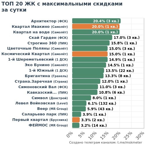 🟩 Честные скидки: 20 ЖК (588 кв.) 🟧 Маркетинг скидки: 15 ЖК (92 кв.) 💎 МАКСИМАЛЬНАЯ ЭКОНОМИЯ 🏆 ФСК • Скай Гарден └🔻4.9M → 28.8M • 3-к 83м²❗️ 🥈 Гранель • Бригантина └🔻3.4M → 26.0M • 3-к 87м²❗️ 🥉 ПИК • Кавказский бульвар 51 └🔻2.9M → 27.7M • 3-к 88м² 4️⃣ ФСК • Симоновский Вал ├🔻2.9M → 26.3M • 3-к 60м² └🔻2.6M → 25.9M • 3-к 55м² 5️⃣ ПИК • Строгино 360 └🔻2.7M → 17.1M • 1-к 34м² 6️⃣ Самолёт • Квартал на воде └🔻2.3M → 11.7M • Студия 26м²❗️ 7️⃣ MR Group • ФЕЙМОС └🔻2.2M → 68.9M • 3-к 101м² 🔑 САМЫЕ ДОСТУПНЫЕ 🏆 1 ДСК • 1-й Химкинский ├🔻70к → 5.4M • Студия 19м² ├🔻73к → 6.0M • Студия 26м² └🔻74к → 6.1M • Студия 26м² 🥈 1 ДСК • 1-й Южный ├🔻637к → 8.9M • Студия 25м² ├🔻539к → 8.9M • Студия 25м² └🔻1.1M → 9.0M • Студия 28м² 🥉 Самолёт • Цветочные Поляны └🔻1.6M → 10.7M • 2-к 39м²❗️ 4️⃣ Самолёт • Эко Бунино └🔻1.6M → 11.2M • 1-к 38м² ❗️— лоту меньше месяца 👇 Полная статистика: 📲 В Telegram | 🌐 На MskMeter.ru