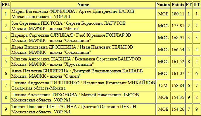Такие вот во многом неожиданные результаты. Кто бы мог подумать, что Оля Сабада/Павел Астахов со 2-го промежуточного места улетят на 7-е, а София Касинс/Саша Брегей с 7-го поднимутся на 3-е. В парах каждая грубая ошибка стоит очень дорого и серьезно влияет на итоговые результаты. Что остается стабильным, так это победы Полины Шешелевой/Егора Карнаухова, которые на этот раз набрали больше 200 баллов.