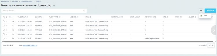 В некоторых редакциях «1С-Битрикс: Управление сайтом» (например, при наличии модуля «Веб-аналитика» или в редакции «Бизнес») предусмотрена возможность выгрузки журнала событий через административный интерфейс. Чтобы проверить наличие такой функции: