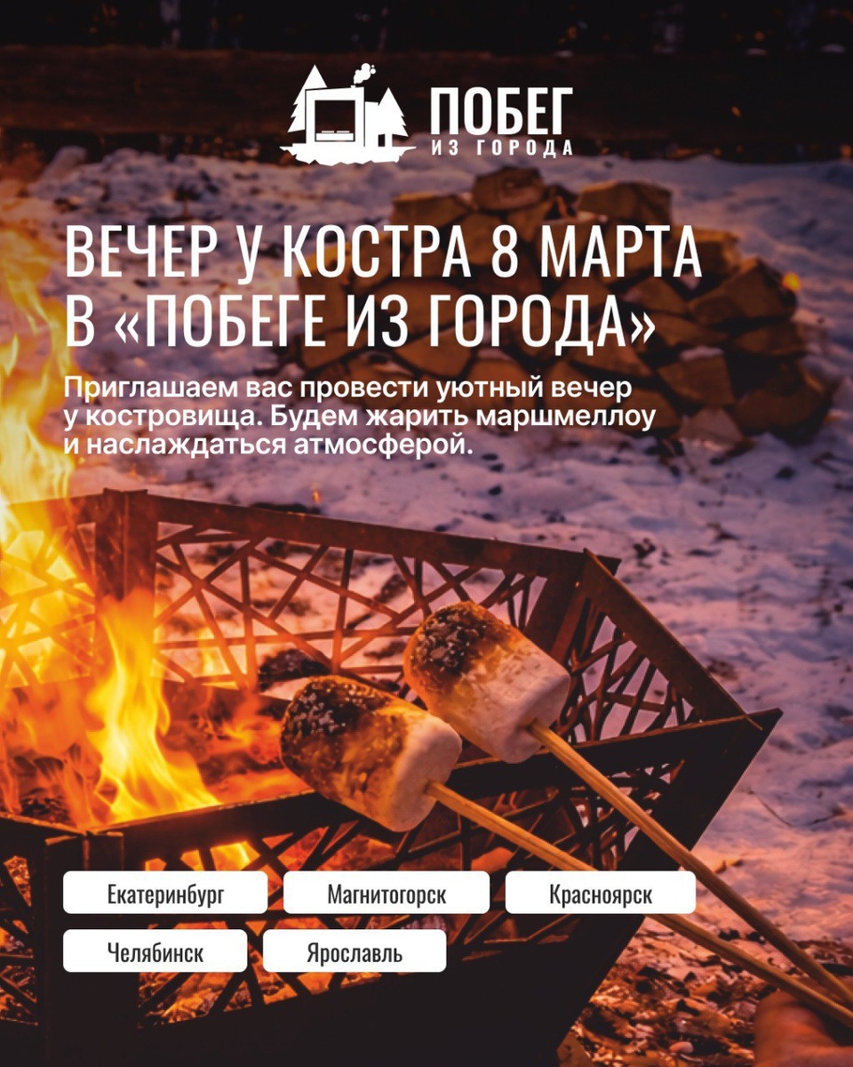 ❤️ Будем вместе жарить маршмеллоу, общаться, смеяться и просто наслаждаться атмосферой уюта и весеннего настроения. Проведём этот вечер в кругу гостей, с огоньком костра, сладостями и приятной компанией. Ждём вас, чтобы разделить этот особенный праздник вместе. *Города участия: Екатеринбург, Магнитогорск, Красноярск, Челябинск, Ярославль. Забронировать домик: https://www.tvoi-pobeg.ru/?utm_source=tg