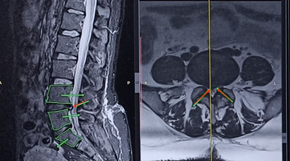 Ее МРТ на фото выше👆 Постоянная боль в правой ноге с июня 2025 года. Боль появилась после операции по удалению грыжи на уровне L4–L5. В июне 2025 грыжу прооперировали. Через время — рецидив на том же уровне. За плечами: — несколько стероидных блокад — физиолечение — пиявки — остеопат — ЛФК Без существенного улучшения. И главный вопрос, с которым она пришла: Оперироваться снова или нет? Как думаете? Разберём факты. Что настораживает в сторону повторной операции: — Хроническая, постоянная боль. А это значит, что нервная система уже стала гиперчувствительной. Даже после операции боль может сохраниться. — Ткани вокруг грыжи находятся в состоянии хронического воспаления. — Сопутствующие состояния: синдром раздражённого кишечника, бессонница, депрессия, избыточный вес. Это системные факторы, которые ухудшают восстановление.Что не в пользу «простого» консервативного пути: — Рецидив грыжи. — Смещение позвонков (листез) — нестабильный сегмент. — Грыжа расположена под связкой — труд