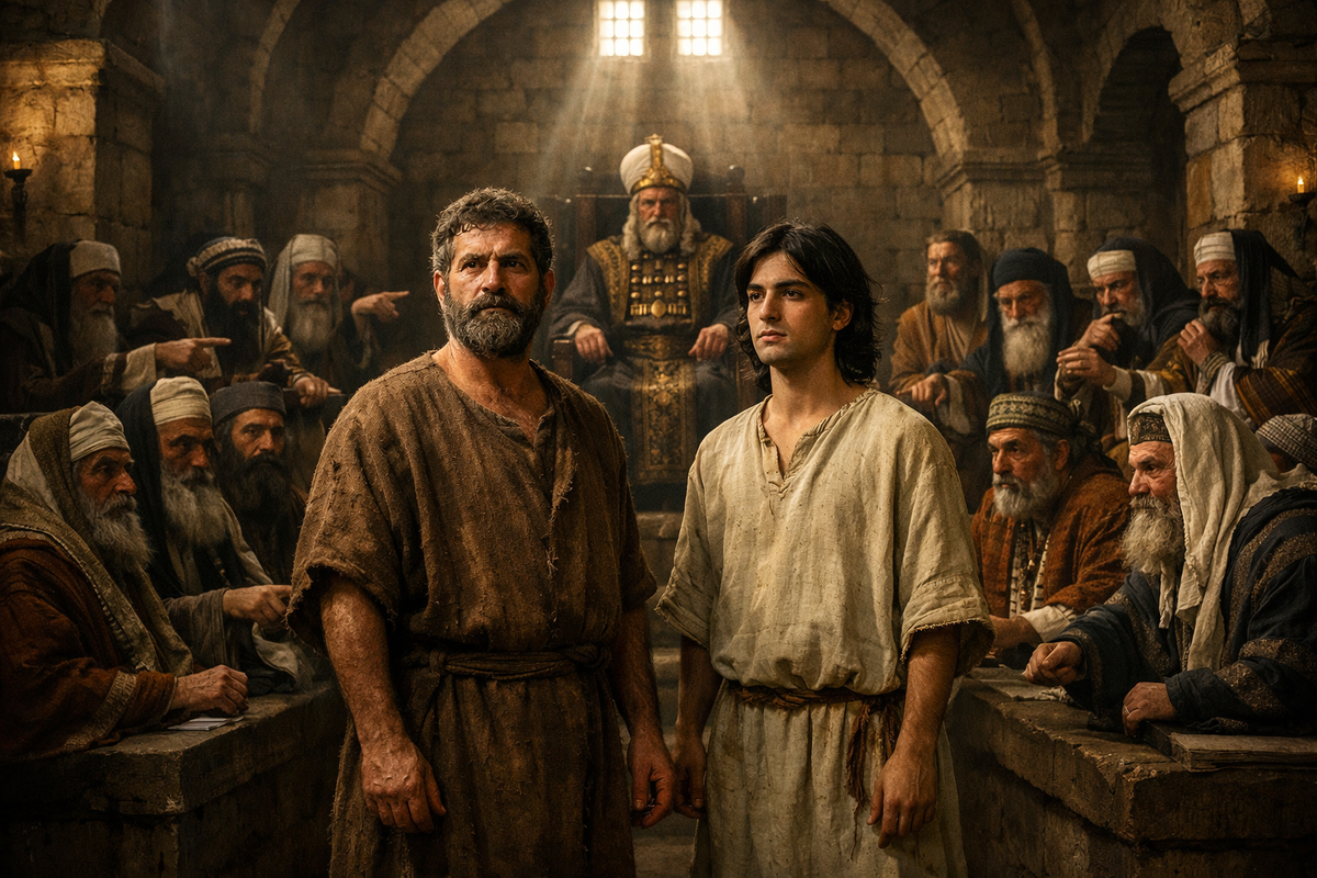 Синедрион собрался в большом зале с высокими сводами. Первосвященники, старейшины и книжники сидели в центре. Анна (в то время это было мужское имя) и Каиафа, самые могущественные люди Иудеи, расположились на возвышении. Рядом – родственники первосвященников, знатные фарисеи и саддукеи в богатых одеяниях. Апостолов поставили посреди зала. Пётр огляделся: Иоанн стоял рядом со спокойным лицом. Он увидел стражников у дверей и надменные лица судей. Вдруг рядом с ними поставили ещё одного человека – исцелённого хромого. Исцелённый стоял прямо, не боясь. Первосвященник Анна подал знак, и глашатай призвал к тишине. – Вы обвиняетесь в возмущении народа и проповеди ложного учения, – голос Анны был сух. – Какой силой или именем вы сделали это? Он кивнул в сторону исцелённого. Зал погрузился в тишину. Пётр глубоко вздохнул и почувствовал необычайное спокойствие. Дух Святой сошёл на него. – Начальники народа и старейшины Израильские! – голос Петра звучал громко и уверенно. – Если вас интересует,