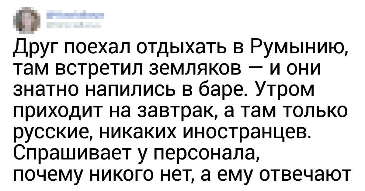 Друг поехал отдыхать в Румынию, там встретил земляков, и решили они это дело отметить, знатно напились в баре и разошлись по номерам в отеле. Утром приходит на завтрак, а там только русские сидят, никаких иностранцев. Спрашивает у обслуживающего персонала, почему никого нет, а ему отвечают, что, оказывается, ночью было землетрясение, все немцы, англичане и французы принялись поскорее заказывать автобусы в посольства и разъехались, а русские спят, их не разбудишь. После друг отца и говорит: "Я чувствовал, что меня качает, думаю, вот это я погулял, что уже даже лежа качает". © eyeswideshut27 / Pikabu