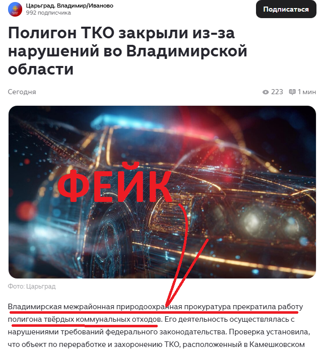 "Полигон ТКО закрыли из-за нарушений во Владимирской области" — громыхнуло на днях издание Царьград. Заголовок — огонь, подписи — патриотичные, читатель — верит. Да ну, правда что ли? Враньё галимое: перебоев с вывозом мусора и паники на предмет того, куда теперь везти ТБО, не возникло. И не могло возникнуть, потому что полигон возле деревни Марьинка в Камешковском районе продолжает работать как работал. Принимает отходы из Владимира, Коврова, Суздальского района и окрестностей. Если отмотать ленту назад, выясняется, что реальные проблемы у полигона были, но они совсем не про бумажки. Суд, естественно, обязывает бумажку получить. Компания идёт и получает. Разрешение есть. Победа? Для прокуратуры — галочка. Для Царьграда — сенсация. Для жителей — ничего не изменилось. Полигон никто не закрывал. Компания оформила разрешение и преспокойно работает дальше. Мусор возят, машины пылят, фильтрат — вот вопрос! — течёт или нет? А хрен его знает. Потому что ни Царьград, ни другие СМИ, подхватив