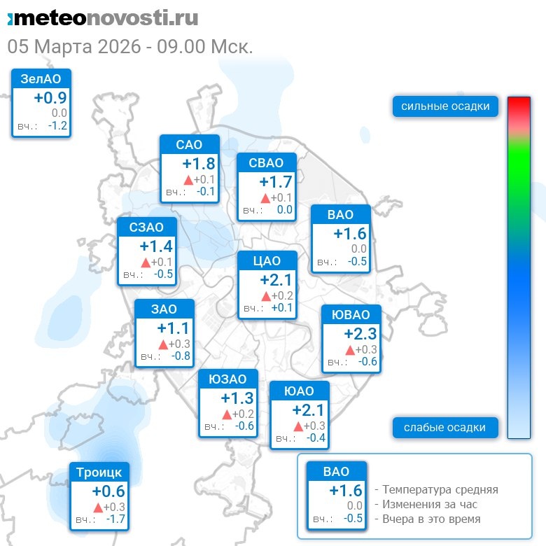 В 9:00 в Москве было от +0.2°C до +2.7°C, средняя температура +1.7°C #погода #Москва #весна #температура #5марта #четверг