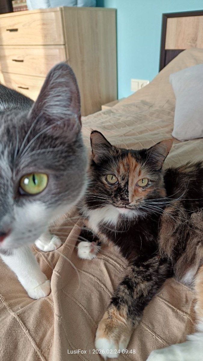 К сожалению дядя Жорик больше не с нами. Остались мы с Шуней (Шушпан, офицер Шушпандель) вдвоём. Та, что на фото самая красивая, это я! Мадам Басям, Басямба и Басенька( мне 7 лет), прекрасная химера и хозяйка Дворца торжеств. - Да какая там хозяйка, ты ж у них на стройке бомжевала. - Я не бомжевала, я просто убежала из дома и не нашла дорогу обратно. Вот и осталась наблюдать за строительством. А потом пожила немного во Дворце, молодоженов встречала на мраморной лестнице. Понятно тебе, гопота Домодедовская? - Ха! Да, я родилась 10.09.20 в подвале, нас с сестрами, братом и мамкой сразу в приют передали, а потом в котоясли к Наташе (Котоблог). - Я старше, я вращалась в культурных праздничных кругах. Значит ты должна меня слушаться! - Ага, прям разбежалась! Ты меня не принимала целый месяц, когда меня малышкой привезли домой, гоняла меня пока Жорик тебе лапу на лоб не поставил. А теперь я выросла и иногда гоняю тебя😸Но мы же все равно хорошо ладим?😻🌷😻