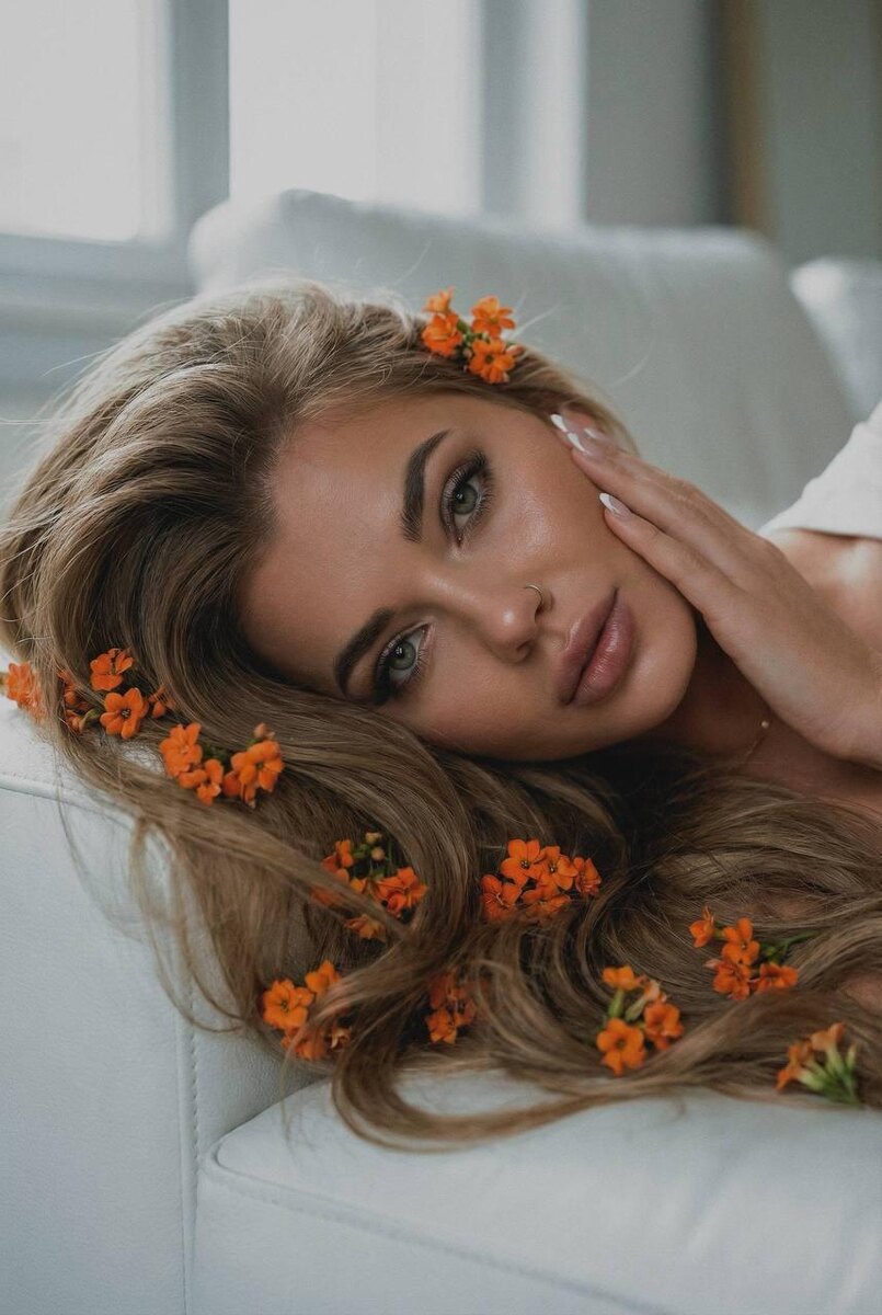 Сгенерировать фото⚡️ Сохрани идентичность человека и черты лица с референса; не изменяй лицо и узнаваемость. Экстремальный крупный план портретной фотографии, снятый на среднеформатную камеру Hasselblad с объективом 80mm, запечатлевающий спокойную девушку, лежащую на безупречном белом диване в мягком естественном свете. Её объёмные, блестящие длинные волосы каскадом частично падают на лицо, развевающиеся ветром и люминесцентные, украшенные в изобилии яркими маленькими оранжевыми цветами, вплетёнными повсюду. Её кожа сияет с тонким контровым освещением и стратегическими бликами, демонстрируя безупречный тон лица с видимым французским маникюром. Кинематографическая эстетика включает тонкое плёночное зерно и тонкую цветокоррекцию с тёплыми персиковыми тонами на фоне прохладного белого. Снято с малой глубиной резкости, акцентируя черты лица при сохранении её естественных выражений и характерной структуры лица. Объёмный мягкий свет создаёт интимное, расслабленное настроение, напоминающее с