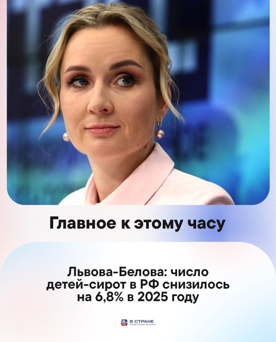 : 🔹Львова-Белова: число детей-сирот в РФ снизилось на 6,8% в 2025 году. 🔹В России введут механизм взыскания долгов за ЖКУ в электронном виде. 🔹Маткапитал в 2027 году может превысить 1 млн рублей. 🔹В России появились новые критерии лечения больных гепатитом С. 🔹Росстандарт утвердил новый ГОСТ на белый хлеб и творог. 🔹Женщинам стало легче строить карьеру в России, показал опрос. ✅ «В Стране» в MAX