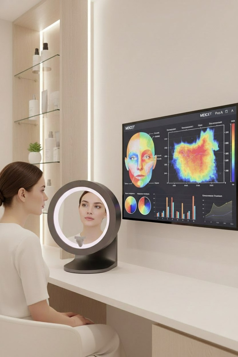 Узнайте все проблемы кожи, которые не видно в зеркале, но анализатор выявляет их за секунды. На обычном свете вы видите только то, что уже вышло на поверхность: веснушки, пятна после акне, возрастную пигментацию. MEICET Pro A с помощью UV‑подсветки показывает скрытые скопления меланина в более глубоких слоях — будущие пятна, которые пока не видны, но уже формируются. Это шанс вовремя усилить защиту от солнца и добавить корректирующий уход, не дожидаясь явных коричневых пятен. Фотостарение — это не только глубокие морщины. Анализатор подсвечивает участки хронического УФ‑повреждения: зоны, где кожа уже истончена, где нарушен тонус и есть микровоспаления. В зеркале вы видите просто «тусклый тон», а на MEICET уже карту участков, которым нужна защита и восстановление. Многим кажется: если кожа блестит, значит, с влагой всё в порядке.