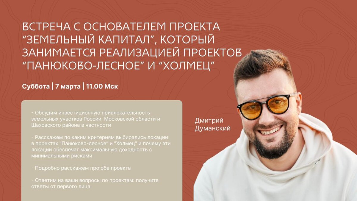 ️‼️ 🌟 ПРИГЛАШАЕМ НА ВСТРЕЧУ С ОСНОВАТЕЛЕМ ПРОЕКТА "ЗЕМЕЛЬНЫЙ КАПИТАЛ"! 🌟 Когда: Суббота, 7 марта ⏰ Время: 11:00 (МСК) 👤 Спикер: Дмитрий Думанский 💰 Инвестиции в землю от 450 000 руб. 📈 Доходность 30-50% годовых! Будем ждать вас💖 Ответим на все ваши вопросы! 🔗 Ссылка на встречу будет размещена за 15 минут до начала Не упустите возможность получить информацию из первых рук! 🚀
