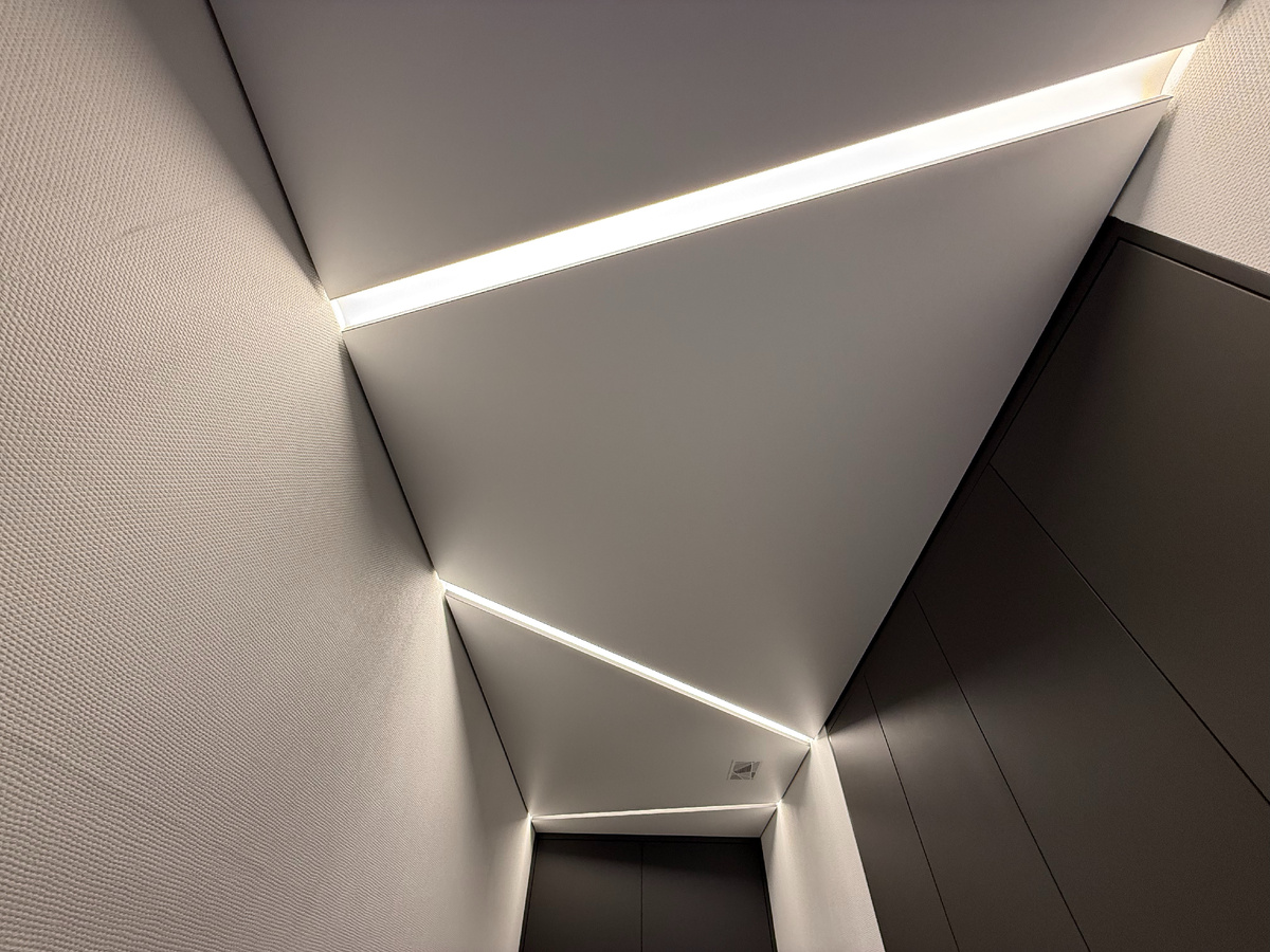 Натяжные потолки — это особая конструкция, представляющая собой полотно из специальной плёнки или ткани, натянутое на металлический или пластиковый каркас. Каркас крепится к стене или потолку, образуя идеальную плоскость, скрывающую любые неровности базового перекрытия.