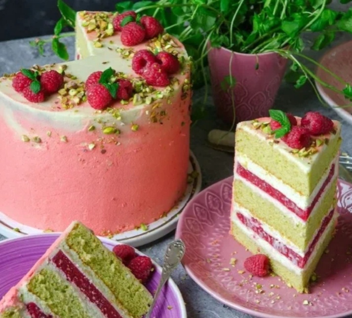 Этот торт состоит из нежных фисташковых бисквитов, легкого крема на основе сливочного сыра и кисло-сладкой малиновой прослойки. Десерт получается не приторным и очень нарядным.