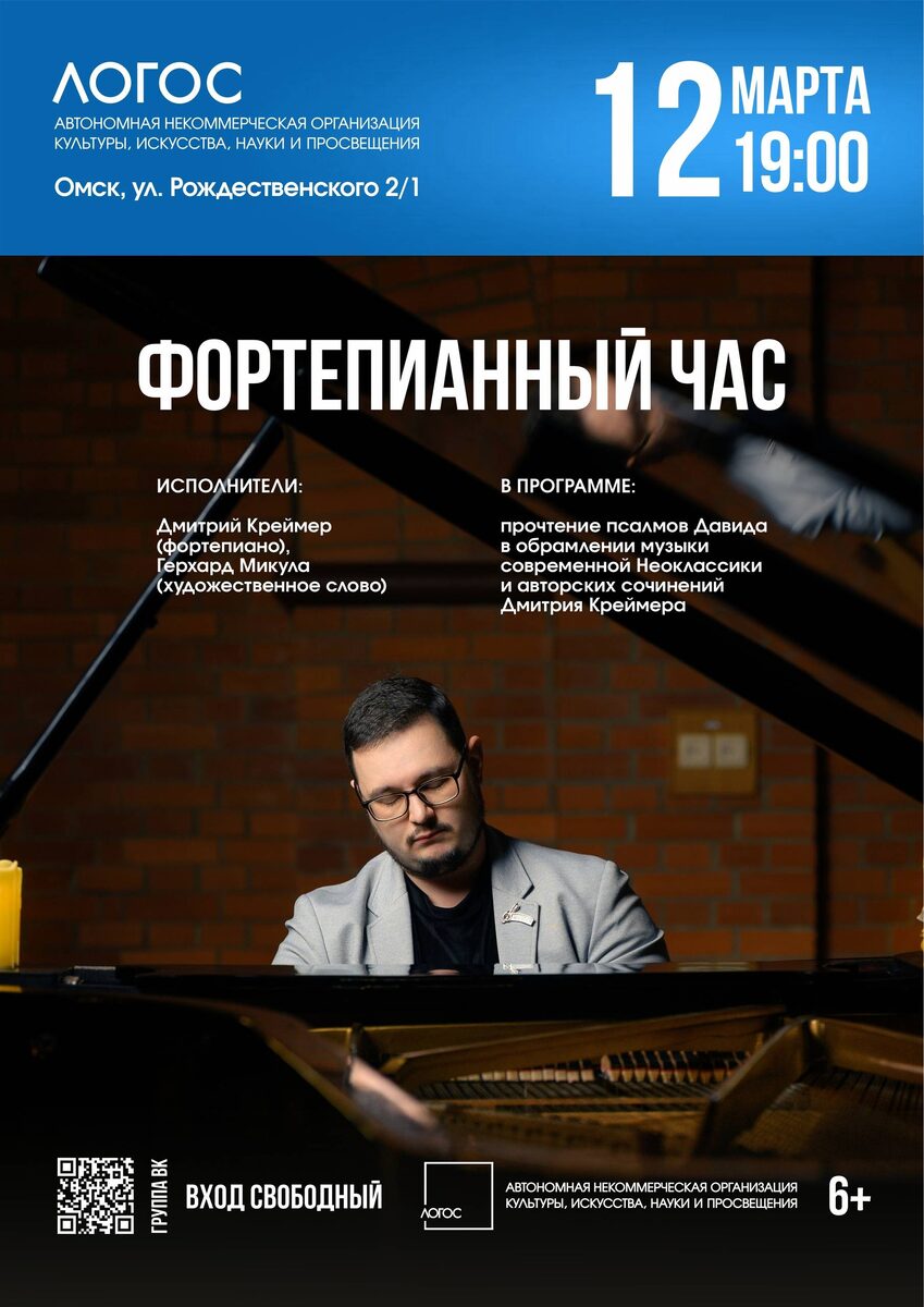 Концерт с фортепианной музыкой современных неоклассиков и чтением Псалмов Давида. Исполняют Дмитрий Креймер и Герхард Микула. Начало: 12 марта 2026 19:00 Стоимость: Бесплатно Адрес: г Омск, ул Рождественского, д 2/1 Организатор: https://vk.com/public227196844 Друзья, приглашаем вас на «Фортепианный час»! 12 марта в 19:00 в Лютеранской церкви состоится концерт, где снова встретятся Слово и Музыка. Но если в прошлый раз над нами властвовал величественный орган, то теперь пространство наполнится более камерным, доверительным звучанием — звучанием фортепиано. Исполнители: 🎹 Дмитрий Креймер (фортепиано) 📖 Герхард Микула (художественное слово) В программе вечера: Глубокое погружение в тексты Псалмов Давида в обрамлении проникновенной музыки... #мода_и_стиль_создание_имиджа Узнать подробности, адрес или записаться на событие.
