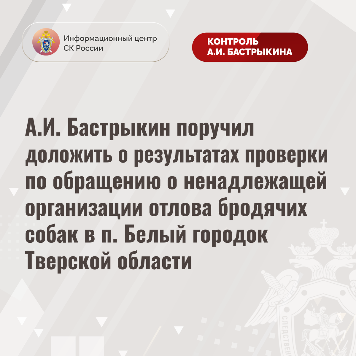 А.И. Бастрыкин поручил доложить о результатах проверки по обращению о ненадлежащей организации отлова бродячих собак в п. Белый городок Тверской области К Председателю СК России А.И. Бастрыкину через Информационный центр поступило обращение по вопросу ненадлежащей организации отлова бродячих собак в поселке Белый городок Тверской области. Длительное время вблизи железнодорожной станции обитает большое количество животных без владельцев, которые систематически нападают на местных жителей. Так, несколько лет назад агрессивная собака набросилась на несовершеннолетнюю девочку, укусив за лицо. Пострадавшей потребовалась медицинская помощь. Несмотря на имеющиеся нарушения, отлов животных не осуществляется. В СУ СК России по Тверской области организована процессуальная проверка. Председатель Следственного комитета Российской Федерации Александр Иванович Бастрыкин поручил руководителю СУ СК России по Тверской области Альберту Андреевичу Кизимову доложить о предварительных и окончательных резу