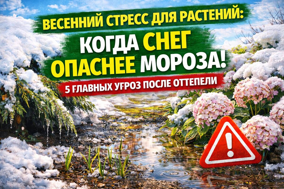 Парадоксально, но факт: в период оттепели с огромным количеством талой воды растениям может быть хуже, чем в сильный мороз. Мороз — это понятная угроза. А вот переувлажнение, выпревание и ледяная корка — скрытые проблемы, которые становятся заметны только весной. Если на участке лежат большие сугробы и началась активная оттепель, стоит понимать, что именно происходит с растениями прямо сейчас. Зимой снег — это утеплитель. Он защищает корни от промерзания и перепадов температур. Но при резкой оттепели ситуация меняется: В результате образуется «мокрая подушка», а иногда и ледяная корка. И вот здесь начинается стресс для растений. Под плотным мокрым снегом: Растение словно оказывается в «тепличной бане», но без света и кислорода. Страдают: Признаки выпревания весной: Если талая вода стоит на участке несколько дней, корни испытывают кислородное голодание. Корневая система не дышит. Особенно это опасно для: Чем тяжелее глинистая почва, тем выше риск. При циклах «днём плюс — ночью минус» на