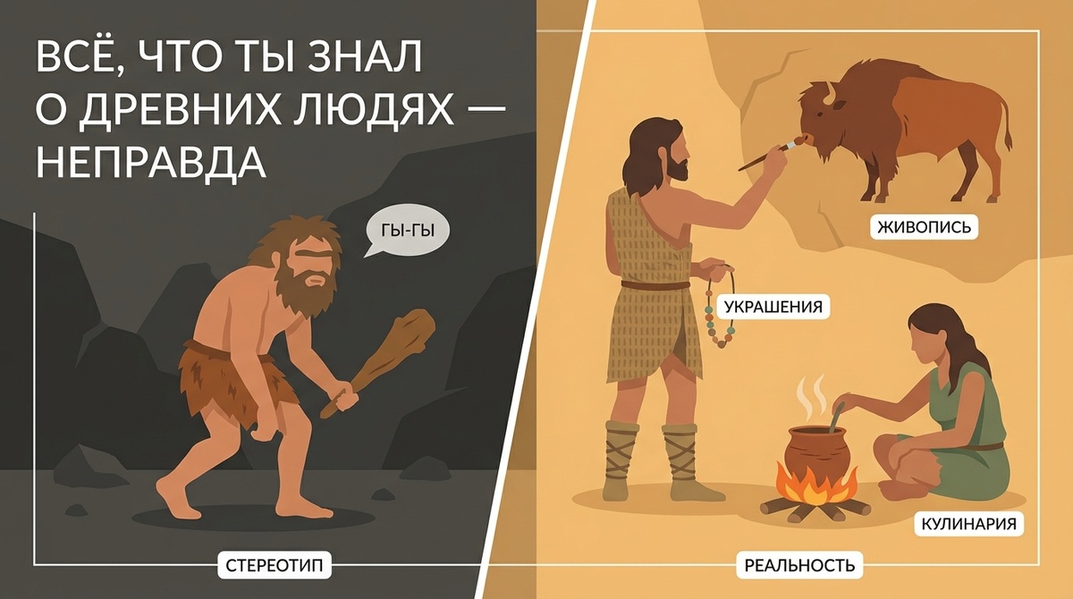Я вырос с этим образом. Школьный учебник, «Флинстоуны», «Ледниковый период» — всё в одном направлении. «Дикий, тупой, примитивный».
