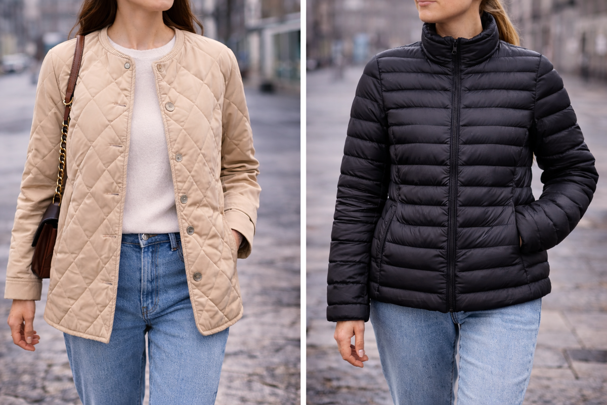 Стёганая куртка и лёгкий пуховик снаружи похожи, но ощущаются по-разному. Оба варианта подходят для весны, когда уже не зима, но ещё прохладно.