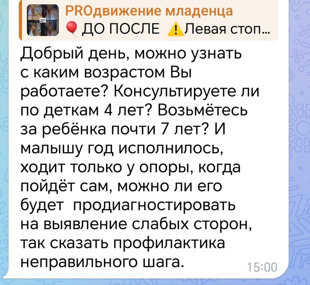 Да, работаю со всеми указанными возрастами: с малышом по всем двигательным навыкам, со взрослыми с шагом