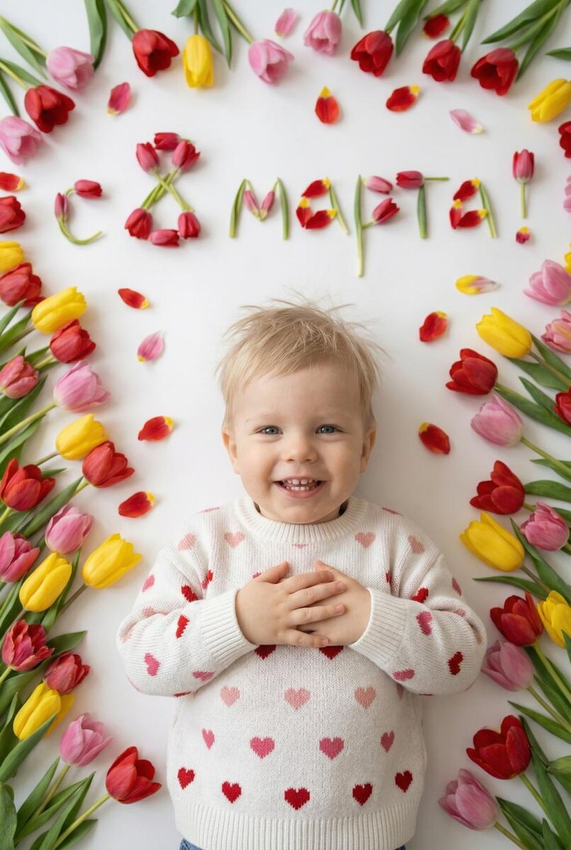 Модель: Nano Banana Сгенерировать🪄 Используй загруженную фотографию как face reference. Строго полное сохранение лиц 1:1: черты, пропорции, форма лица, нос, губы, скулы, подбородок, брови, посадка глаз, цвет глаз, линия роста волос, возраст, телосложение. Лица нельзя менять, нельзя “улучшать”. Естественная текстура кожи, поры кожи, (без пластика), реалистичные глаза с живыми бликами, правильные зрачки, без “стеклянных” глаз. Персонаж лежит на светлом фоне, на циклораме, фото по пояс, ракурс сверху. Персонаж в свитере белом в сердечки. Персонаж по пояс. Руки держит вместе, улыбается. На полу сверху цветками тюльпанов выложена надпись: с 8 марта! Тюльпаны и их лепестки разбросаны по всему кадру. Милая детская атмосфера.