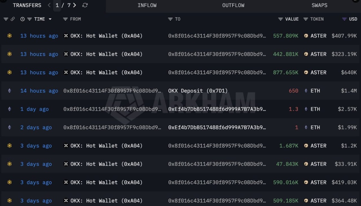 Кит 0x8f01 продал 650 $ETH($1,4 млн) 14 часов назад, а затем купил 1,88 млн $ASTER($1,4 млн). Сейчас у кита 4,45 млн $ASTER($3,18 млн).