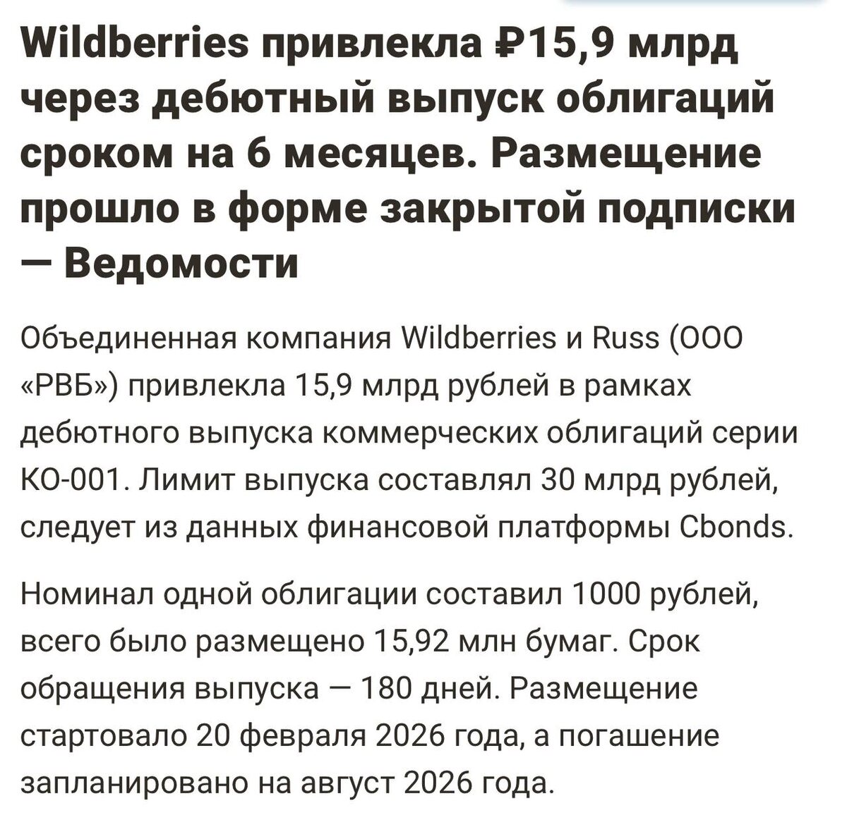 ⬜️ WB привлекла почти 16 млрд через выпуск облигаций сроком на 6 месяцев по закрытой подписке