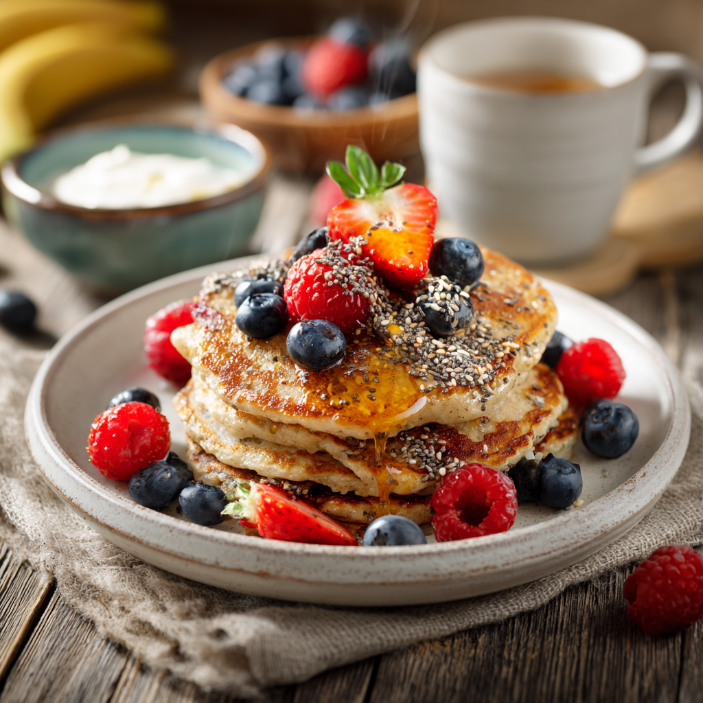 Горсть ягод (свежих или замороженных) или орехов для подачи 1. Если используете цельнозерновые хлопья, замочите с вечера. Тонкие для быстрого приготовления можно не замачивать. 2. Разомните банан в миске, добавьте овсянку, семена и творог/йогурт. Перемешайте до однородной массы. 3. На слегка смазанную маслом сковороду (я использую гхи, сюда ещё подойдёт коксовое) выкладывайте небольшие порции теста, выпекайте по 2–3 минуты с каждой стороны. 4. Подавать с ягодами, орехами. Сластёнам рекомендуем сироп топинамбура, мёд или финиковую пасту.