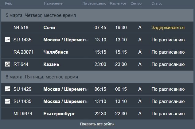 Борт должен был вылететь еще в 7:45, сейчас время поменяли на 19:30. Та же участь постигла пассажиров, которые хотели покинуть курорт — самолет в Магнитогорск перенесли с 6:30 на 19:15. Причиной задержки стали ограничения — 4 марта воздушную гавань закрыли из-за атак БПЛА, сочинский аэропорт не работает более 12 часов. Подписаться | Прислать новость | Мы в MAX