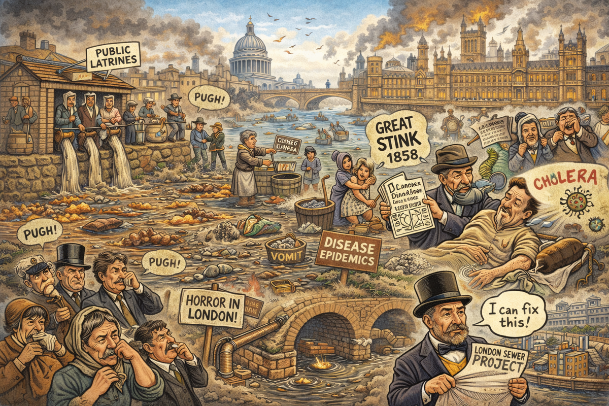 Кульминацией кризиса стал 1858 год, вошедший в историю как «Великая вонь». Лето выдалось необычайно жарким, и Темза буквально превратилась в гигантскую открытую канализацию. Зловоние распространилось по всему городу и достигло даже здания британского парламента.