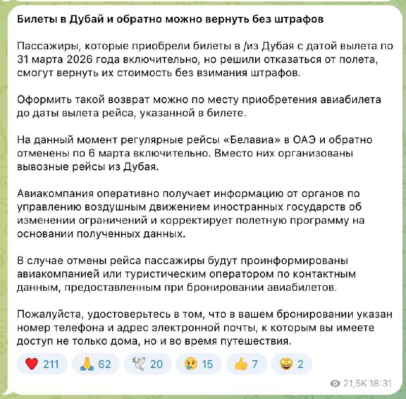 Пассажиры с вылетом по 31 марта 2026 года включительно могут оформить полный возврат - без удержаний. Обратиться нужно по месту покупки до даты рейса. ✔️ Минскач • Подписаться