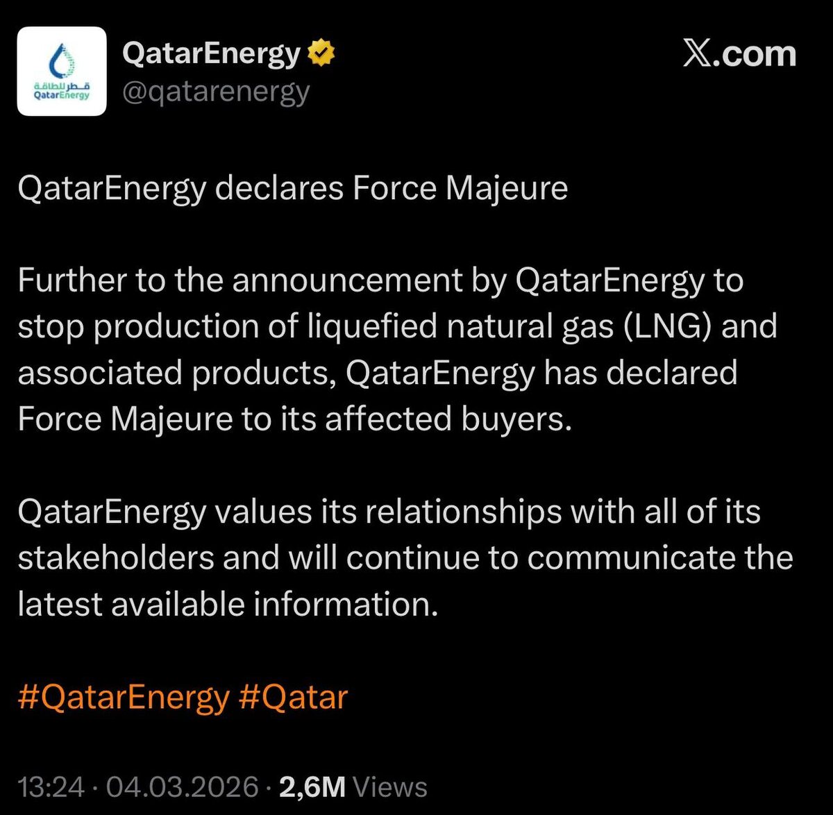 QatarEnergy официально объявила форс-мажор по поставкам LNG. На первый взгляд это просто юридическая формулировка. Но для энергетического рынка она означает довольно жёсткую вещь: поставщик заявляет, что не может выполнять контракт и не обязан это делать. Проще говоря — поставки газа временно остановлены, а покупатели остаются без тех объёмов, на которые рассчитывали. Важно понимать масштаб. Катар — один из крупнейших экспортёров сжиженного газа в мире. Основная часть его LNG идёт в Азию: Китай, Индия, Япония, Южная Корея, Тайвань. Когда такие объёмы выпадают из системы, компании не могут просто «подождать». Им нужно топливо уже сейчас — для электростанций, заводов, промышленности. Поэтому они идут на спотовый рынок. А спотовый рынок — это всегда: меньше предложения выше цена и часто панические покупки. Дальше включается цепочка, которую рынок обычно начинает закладывать почти мгновенно: газ дорожает → электричество дорожает → растёт себестоимость производства → усиливается