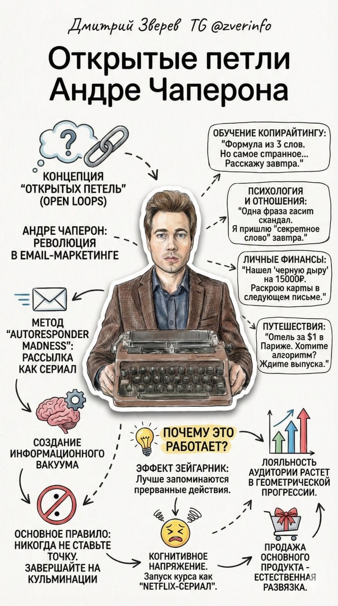 Продолжаю серию про приемы выдающихся инфомаркетологов и копирайтеров. Ранее говорили про Керна и Хэлберта. А теперь - Чаперон. Это легенда сторителлинга, который внедрил технологию «Открытых петель» (Open Loops). Суть: превращение скучной рассылки в захватывающий сериал, который подписчики ждут с нетерпением. Основное правило: никогда не ставьте точку в конце письма. Завершайте его на кульминации, создавая информационный вакуум, который мозг читателя будет стремиться заполнить. Примеры «Открытых петель» в разных нишах: Почему это работает? Потому что включается Эффект Зейгарник. Он гласит: человек лучше запоминает прерванные действия и стремится к их завершению. Открытая петля создает когнитивное напряжение. Когда вы превращаете запуск курса в сериал, лояльность аудитории растет в геометрической прогрессии. Продажа основного продукта в такой цепочке происходит естественно, как развязка в финальном эпизоде сезона. Данную технологию можно применять и в постах, но лучше всего она работае