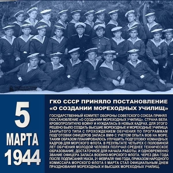 учреждений. 5 марта в России отмечается профессиональный праздник — День мореходных училищ, посвящённый педагогам, курсантам и выпускникам учреждений, осуществляющих подготовку специалистов для морского флота. Дата приурочена к постановлению Государственного Комитета Обороны №5311 от 5 марта 1944 года «О мероприятиях по подготовке командных кадров морского флота», которое заложило основу системы специализированного морского образования в стране. Согласно документу, морские техникумы в Ленинграде и Владивостоке были реорганизованы в высшие мореходные училища, а в Архангельске, Баку, Батуми, Ростове-на-Дону и Николаевске-на-Амуре — в мореходные училища. Высшие учебные заведения осуществляли подготовку штурманов дальнего плавания, инженеров-судомехаников, инженеров-электромехаников и радиоинженеров, тогда как мореходные училища готовили штурманов малого плавания и техников профильных специальностей. Обучение проходило в условиях казарменного режима: курсанты находились на полном государ