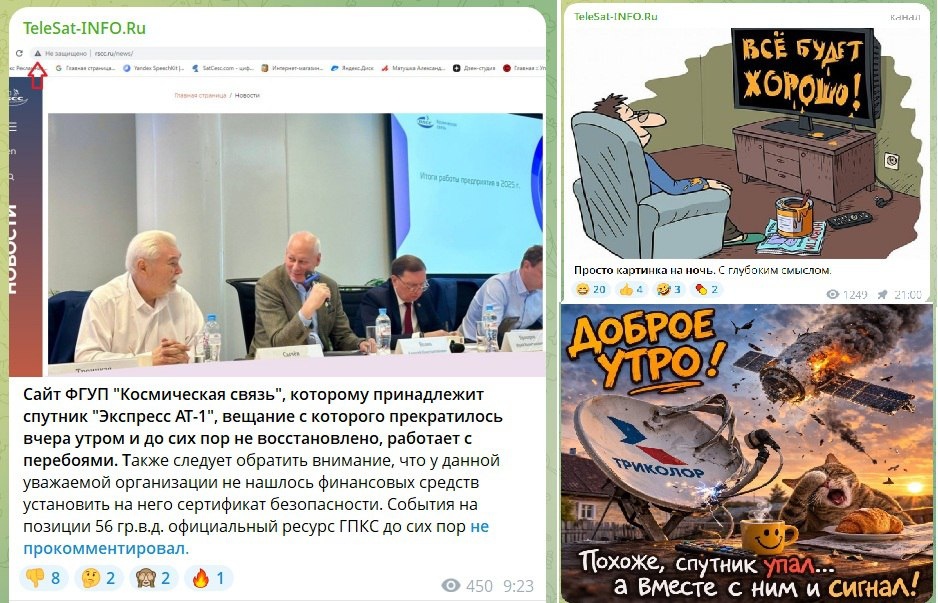 ТВ. Спутниковое вещание - очень дорогое удовольствие для телеканалов, да и смысла больше нет вещать на затерянные деревни, где полторы старухи на старую ржавую тарелку всё равно хотят принимать только Россию 1. А тут к этому тренду, судя по всему, ещё и техническое состояние индустрии подталкивает. Сайт ФГУП "Космическая связь", которому принадлежит спутник "Экспресс АТ-1", вещание с которого прекратилось вчера утром и до сих пор не восстановлено, работает с перебоями. Также следует обратить внимание, что у данной уважаемой организации не нашлось финансовых средств установить на него сертификат безопасности. События на позиции 56 гр.в.д. официальный ресурс ГПКС до сих пор не прокомментировал - сигналит TeleSat-INFO У абонентов операторов спутникового ТВ «Русский мир» и части клиентов «Триколора» и «НТВ плюс» прекратилось вещание. Причина — в помехах на спутнике «Экспресс-АТ1» - передаёт РБК Утром в среду, 4 марта пропал сигнал со спутника «Экспресс-АТ1», с которого ведется вещание с