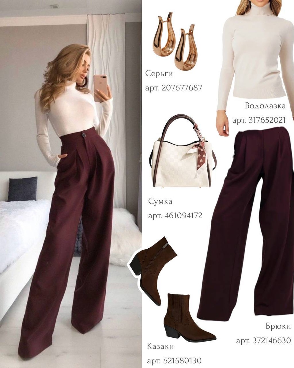Этот образ сочетает минимализм и женственность. Белая водолазка создаёт чистую и универсальную основу, а широкие брюки насыщенного бордового оттенка добавляют образу выразительности. Высокая посадка подчёркивает талию и визуально вытягивает силуэт. Коричневые казаки делают образ более современным и удобным для повседневной носки, а светлая сумка освежает палитру. Золотые серьги завершают образ мягким акцентом.