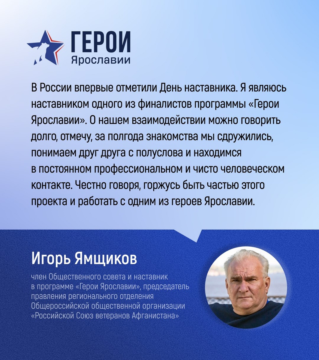 » Обучение по региональной программе «Герои Ярославии», выстроенное через систему наставничества, помогает раскрыть потенциал защитников Отечества на гражданской службе. Чтобы реализовать себя в новой сфере, важен комплексный подход. Стажировки, новые знакомства, лекционные и практические блоки — обучение нацелено на развитие как профессиональных компетенций, так и личных качеств.