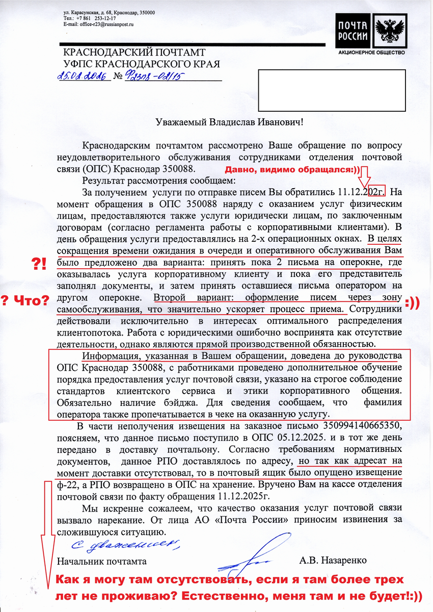 Я вынужден обратиться к Вам с настоящей жалобой на вопиющее бездействие и формальный подход к рассмотрению моего обращения со стороны начальника Краснодарского почтамта Назаренко А.В., что подтверждается полученным мною ответом от 25.02.2026 № Ф23П8-02115 (далее - Ответ Назаренко).