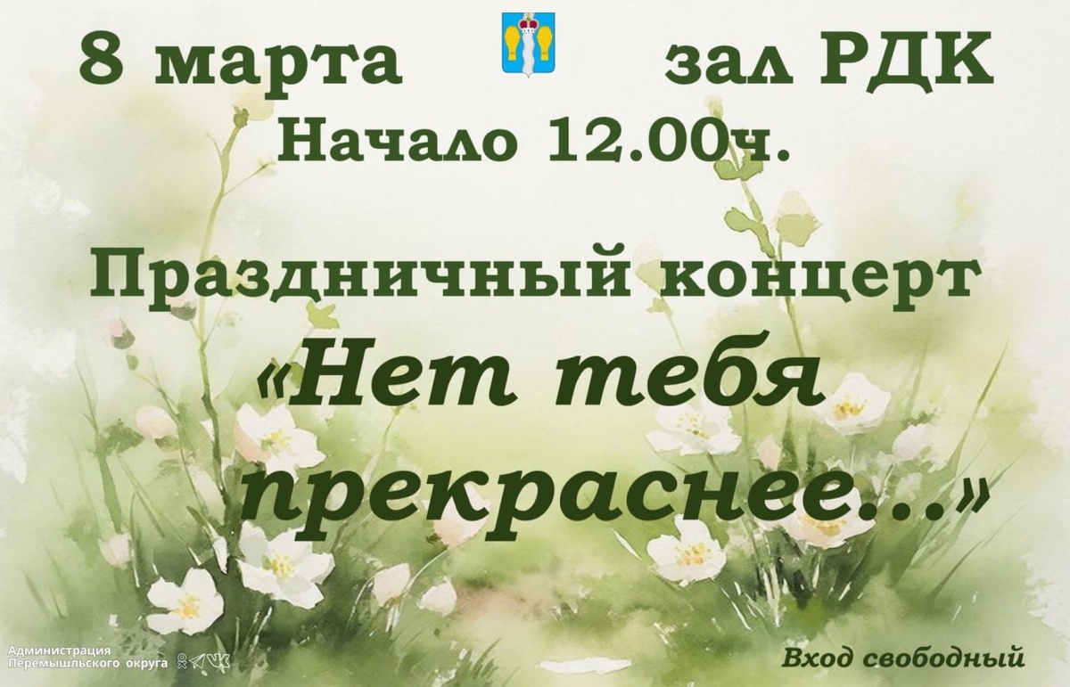 ! 8 марта в 12:00 в зале РДК для вас распахнет двери праздничный концерт «Нет тебя прекраснее...». Приходите, чтобы услышать самые тёплые слова, которые звучат только для вас!💐